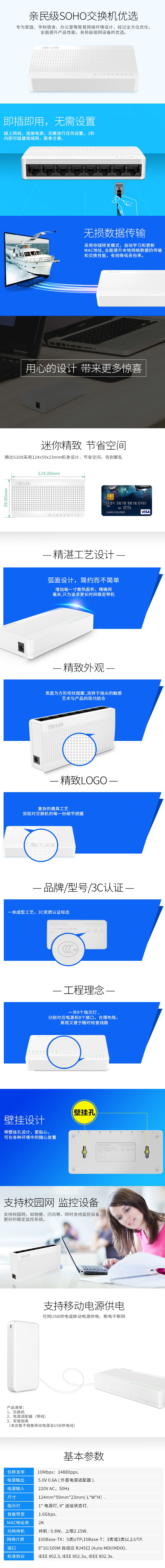| 端口 | 8 *10/100Mbps 自适应RJ45端口 ,支持自动翻转; |